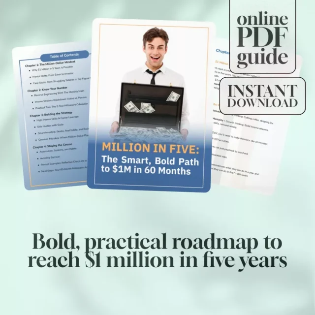 Dreaming of becoming a millionaire but unsure where to start? Million in Five: The Smart, Bold Path to $1M in 60 Months is your ultimate digital guide to achieving financial freedom faster than you thought possible. Designed for ambitious earners, career-driven professionals, and aspiring entrepreneurs, this practical, no-fluff guide walks you through the exact steps to save and grow your way to $1 million in just five years. Whether you’re starting with limited savings or looking to level up your income streams, this guide delivers the mindset, math, and methods to make it happen.